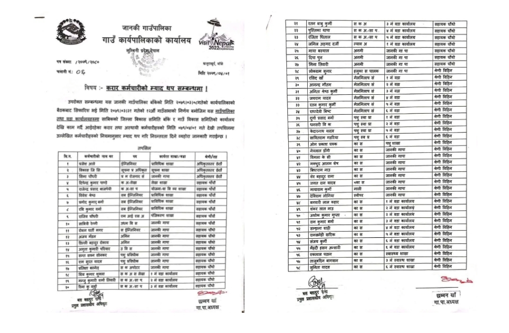 साउन ३, नेपालगन्ज । बाँकेको जानकी गाउँपालिकाले १२ औं गाउँसभाको निर्णय अनुसार गाउँपालिका तथा वडा कार्यालयहरुमा कार्यरत ५८ जना करार तथा अस्थायी कर्मचारीहरुको म्याद थप्ने निर्णय गरेको हो ।गाउँपालिकाको गत असार ८ गते बसेको कार्यपालिका बैठकबाट सिफारिस भई असार ३१ गते भएको गाउँसभाको निर्णय अनुसार