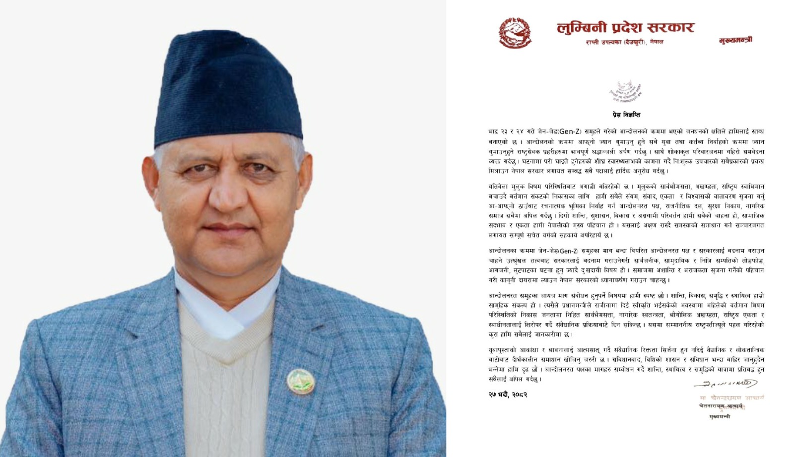 दाङ २७ भदौ । लुम्बिनी प्रदेशका मुख्यमन्त्री चेतनारायण आचार्यले भाद्र २३–२४ मा भएको आन्दोलनपछि उत्पन्न संकटको समाधान संवैधानिक प्रक्रियाबाटै खोज्नुपर्ने बताउनुभएको छ । मुख्यमन्त्री आचार्यले शुक्रबार जारी गरेको विज्ञप्तिमा वर्तमान विषम परिस्थितिमा मुलुकको सार्वभौमसत्ता, भौगोलिक अखण्डता र नागरिक स्वतन्त्रतालाई प्राथमिकतामा राख्दै सबै पक्षले संविधान