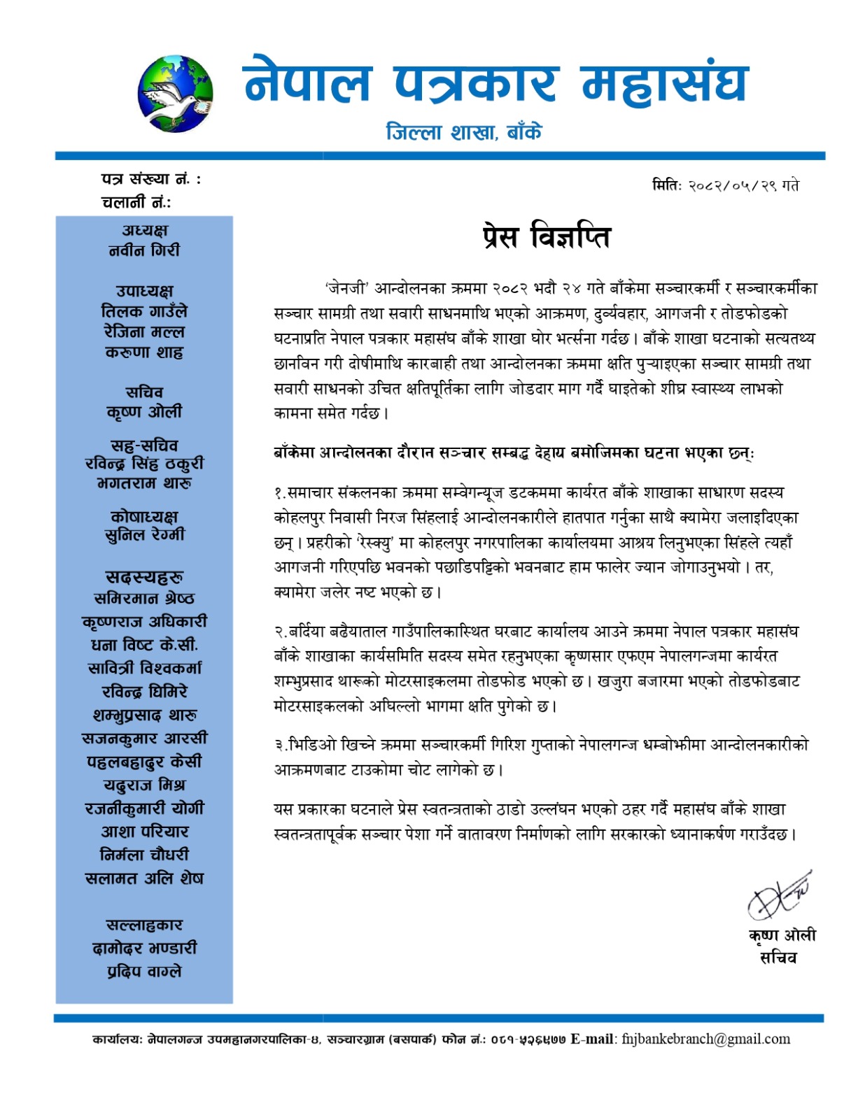 बाँके २९ भदौ । ‘जेनजी’ आन्दोलनका क्रममा २०८२ भदौ २४ गते बाँकेमा सञ्चारकर्मी र सञ्चारकर्मीका सञ्चार सामग्री तथा सवारी साधनमाथि भएको आक्रमण, दुव्र्यवहार, आगजनी र तोडफोडको घटनाप्रति नेपाल पत्रकार महासंघ बाँके शाखा घोर भत्र्सना गर्दछ । बाँके शाखा घटनाको सत्यतथ्य छानविन गरी दोषीमाथि कारबाही