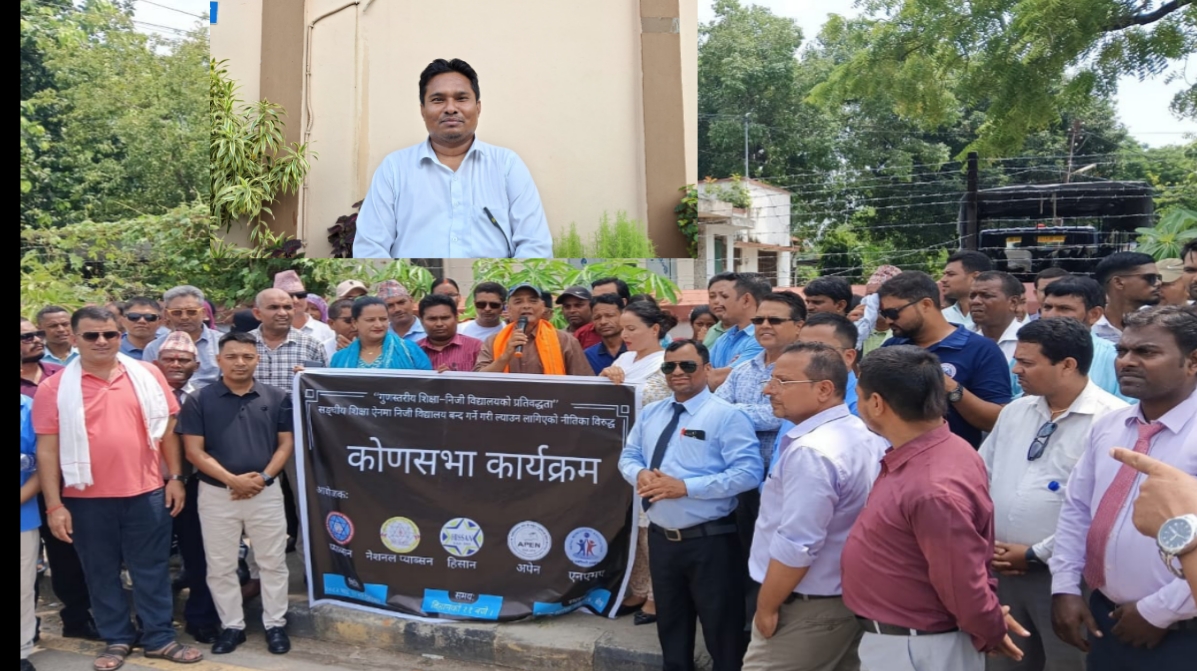 बाँके १८ भदौ । निजी विद्यालयहरुले आज नेपालगन्जमा वृह्त खवरदारी सभा गर्ने भएका छन् । संघीय संसदको शिक्षा, स्वास्थ्य तथा प्रविधि समितिबाट पारित भई संघीय संसदमा प्रस्तुत विद्यालय शिक्षा विधेयकमा समावेश कतिपय प्रावधानहरू निजी विद्यालयहरू प्रतिकूल भएको र यस्ता प्रावधानहरूले निजी शिक्षाको अस्तित्व, स्वतन्त्रता