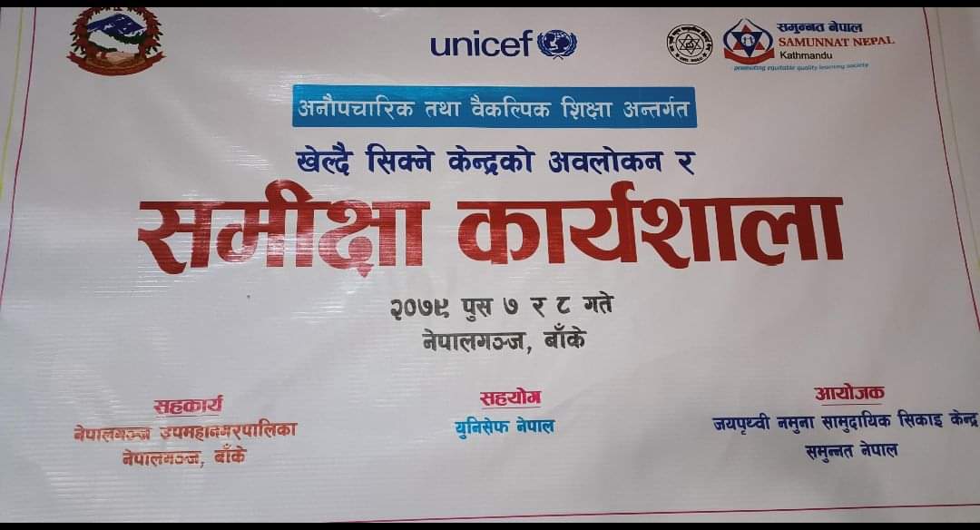 नेपालगंज ८ पुष- अनौपचारिक तथा बैकल्पिक शिक्षा अन्तर्गत संचालित खेल्दै सिक्ने केन्द्रको १९ महिने समिक्षा कार्यशाला आज नेपालगंजमा सम्पन्न भएको छ । जय पृथ्वी नमुना सामुदायिक सिकाई केन्द्र र समुन्नत नेपाल काठमाडौंको संयुक्त आयोजना, नेपालगंज उपमहानगरपालिकाको समन्वय र युनिसेफ नेपालको आर्थिक सहयोगमा समिक्षा बैठक