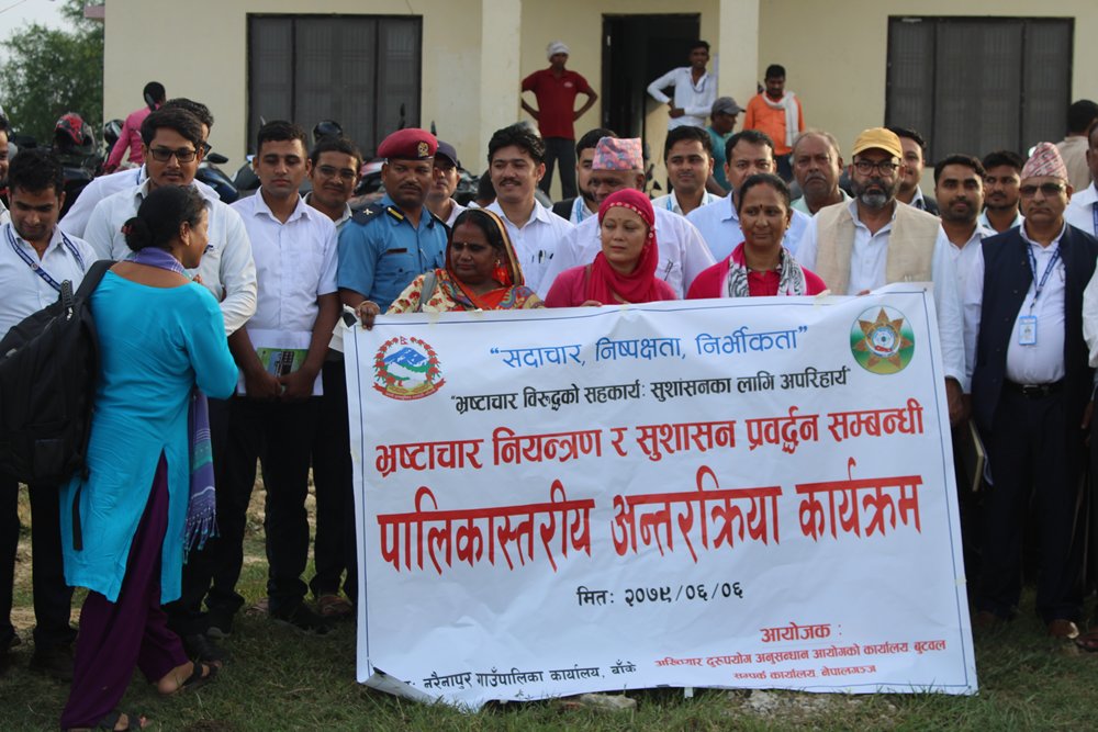बाँके ६ असोज । बाँकेको नरैनापुर गाँउपालिकामा ‘भ्रष्टाचार नियन्त्रण तथा सुशासन प्रवद्र्वन’ विषयक पालिका स्तरीय अन्तरक्रिया कार्यकक्रम सम्पन्न भएको छ । पालिका स्तरीय अन्तरक्रिया कार्यक्रममा बोल्दै नरैनापुर गाँउपालिका अध्यक्ष इश्तियाक अहमद शाहले कानुन बमोजिम काम कारबाही गर्ने व्यक्ति अख्तियारसँग डराउन नपर्ने बताउनुभयो । उहाँले