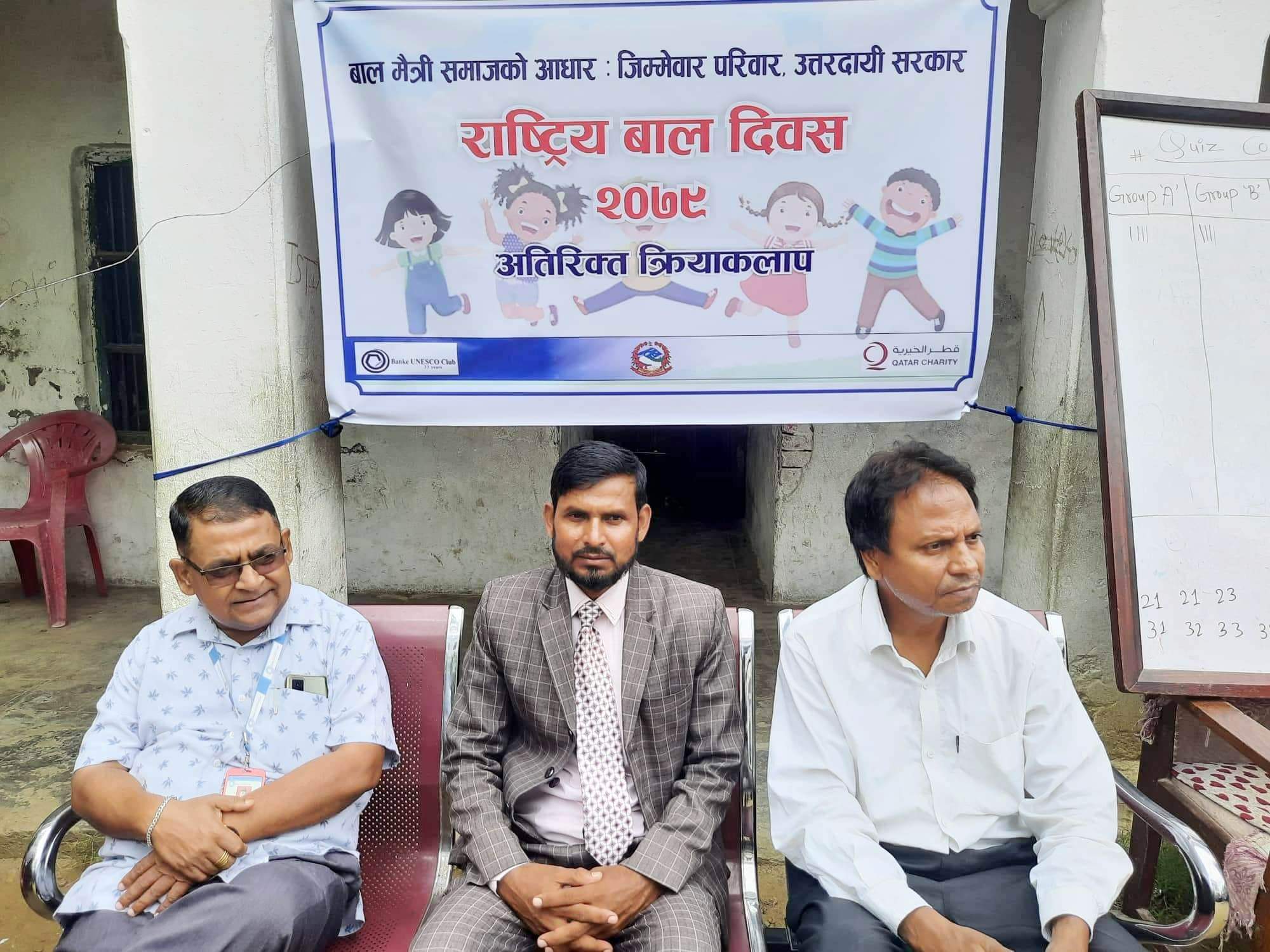 नेपालगञ्ज, भदौ २९ । बाँके युनेस्को क्लबले कतार च्यारिटिको सहयोगमा नेपालगञ्जको एक विद्यालयमा विभिन्न अतिरिक्त क्रियाक्लापको आयोजना गरेर राष्टिय बाल दिवस २०७९ भव्य रुपमा मनाईएको छ । नेपालगञ्ज ६ मा रहेको साईनिंग फ्युचर एकेडेमी नामक विद्यालयमा क्लबद्धारा मनाईएको बाल दिवसमा सो विद्यालयका विद्यार्थिहरुविच बालअधिकारलाई