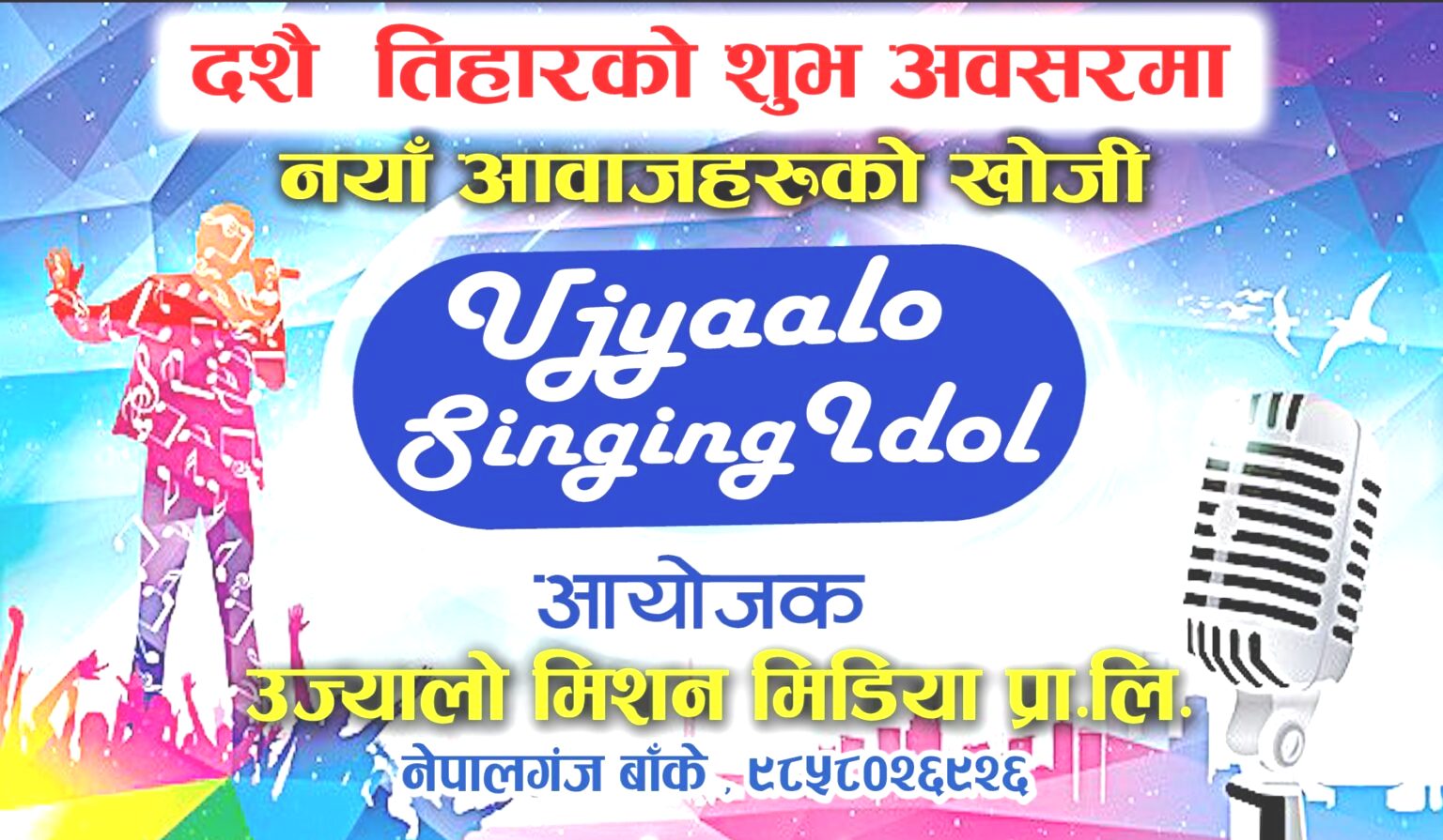 बाँके ८ असोज । उज्यालो मिशन मिडिया प्रा.लि. बाँकेले नेपालगन्जमा दशैँ तिहारको अवसरमा नेपालगञ्जमा डिजिटल सिंगिङ्ग आइडल सञ्चालन गर्ने भएको छ । पश्चिम नेपाललाई संगीतमय बनाउन लगायत क्षमतावान प्रतिभाहरुलाई अवसर दिन र यहाँका नयाँ प्रतिभाहरुलाई विश्वभर सुनाउन कार्यक्रमको आयोजना गर्न लागको उज्यालो मिशन मिडिया