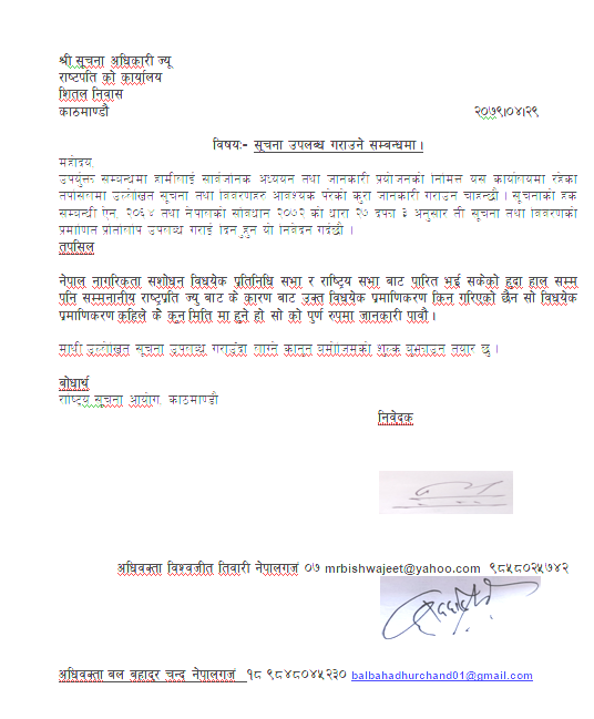 साउन २९, नेपालगन्ज । नेपाली नागरिकता विधयेक प्रमाणीकरणका सम्वन्धमा सूचना माग गरिएको छ । नेपालगन्ज निवासी अधिबक्ताद्धय विश्वजित तिवारी र बलबहादुर चन्दले आज आइतबा राष्ट्रपतिको कार्यालयसंग सूचना माग गर्नुभएको हो । नेपाली नागरिकता संशोधन विधयेक प्रतिनिधी सभामा र राष्ट्रिय सभाबाट पारित भईसकेको हुदा हालसम्म