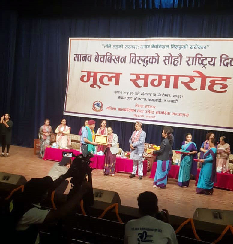 नेपालगञ्ज २० भदौ । नेपाल सरकार, महिला बालबालिका तथा जेष्ठ नागरिक मन्त्रालय, सिंहदरवार, काठमाण्डौको च।नं।४७ मिति २०७९।०५।१९ गतेको पत्रादेशानुसार सोमबार मानव वेचविखन तथा ओसारपसार, रोकथाम, नियन्त्रण र अनुसन्धानको क्षेत्रमा पीडितरप्रभावितहरुको उद्धार तथा न्याय पहुँच पुर्याएको महत्वपूर्ण योगदानको उच्च सम्मान गर्दै मानव वेचविखन तथा ओसारपसार