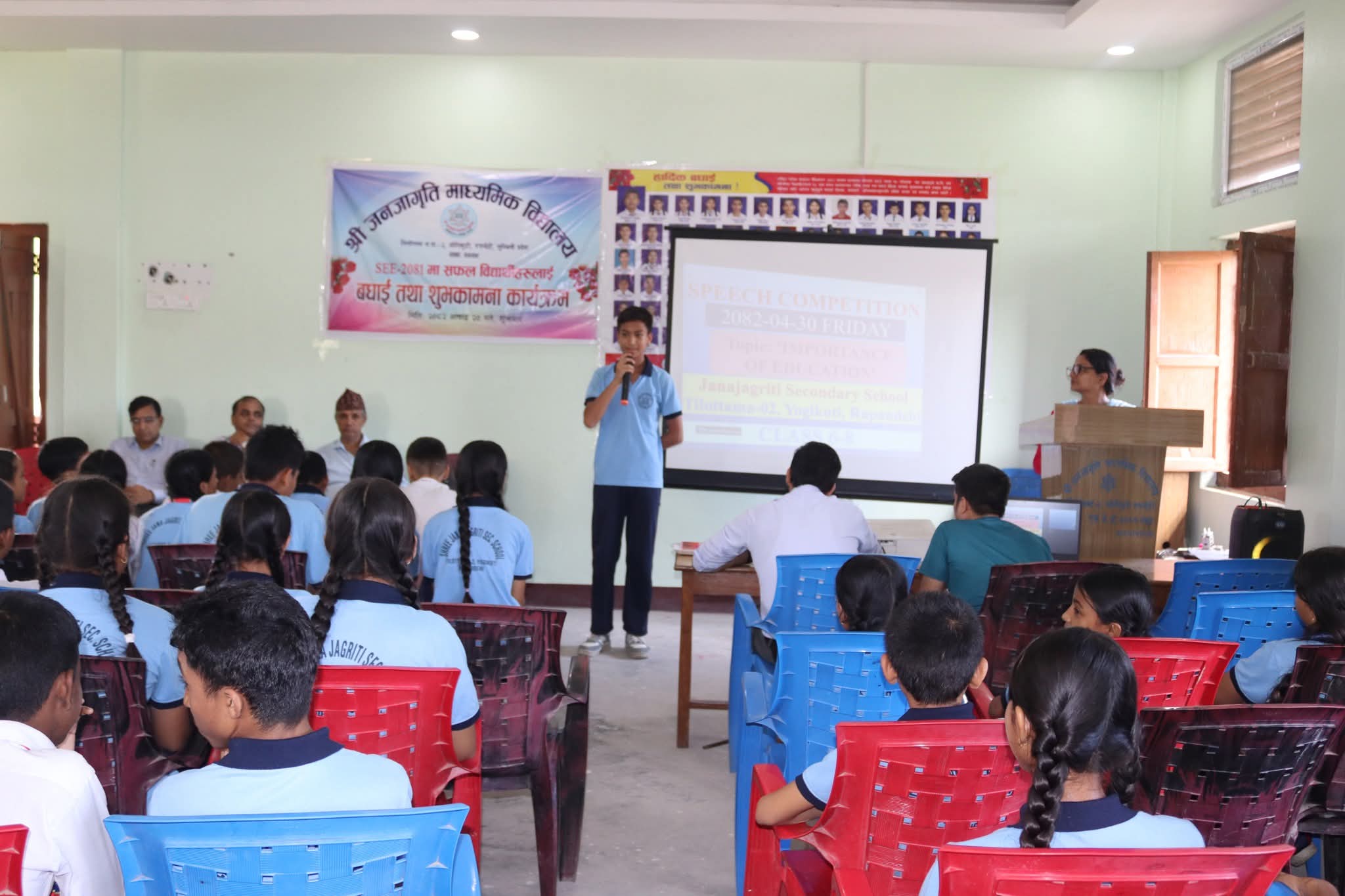 बाँके ३० साउन । जनजागृति माध्यमिक विद्यालयका प्रधानाध्यापक टंक प्रसाद पौडेलको प्रमुख आतिथ्यता, विद्यालयका सहप्रधानाध्यापक खेमराज खनालको विशेष आतिथ्यतामा कक्षा नर्सरी देखि कक्षा ३ सम्म ‘My self introduction’ कार्यक्रम कक्षा ४ देखि कक्षा ५ सम्म ‘My country’ प्रतियोगिता कक्षा ६ देखि कक्षा ८ सम्म