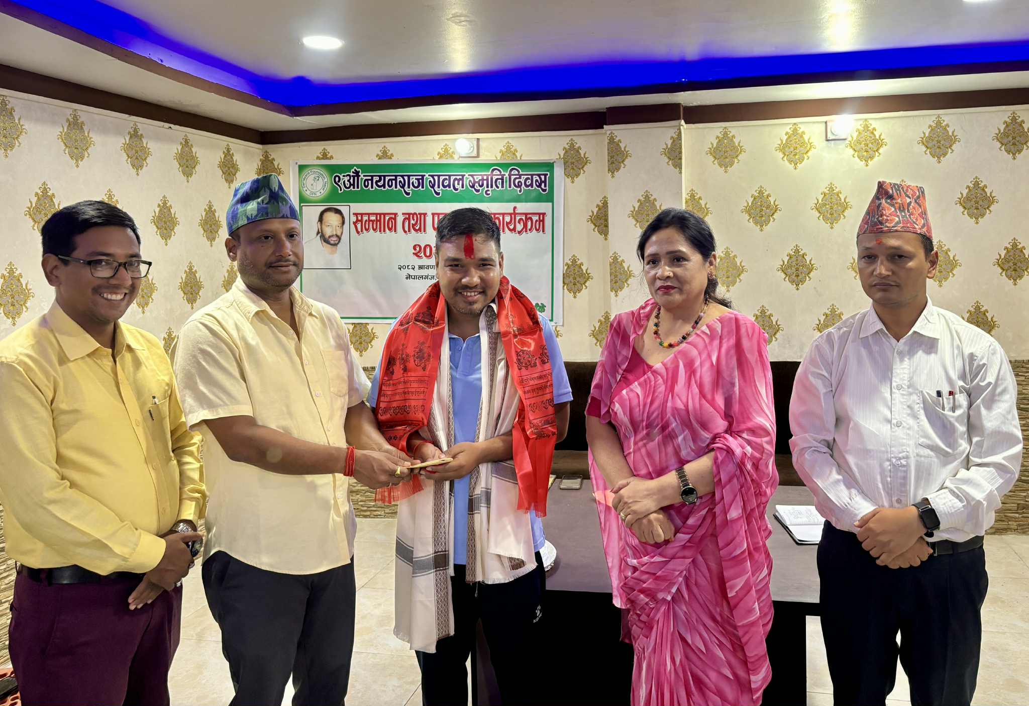 नेपालगन्ज, २९ साउन । नेपालगन्जका पत्रकार रामबहादुर ओली (रामु) लाई बिहीबार ‘नयनराज रावल स्मृति पुरस्कार तथा सम्मान’ प्रदान गरिएको छ। लागुऔषध दुरुपयोगविरुद्ध र सामाजिक पुनःस्थापनका पक्षमा कलम चलाएबापत उनलाई यो सम्मान दिइएको हो। दमयन्ती फाउन्डेसन नेपालद्वारा आयोजित नवौँ स्मृति दिवस समारोहमा रु. १०,००१ राशिको