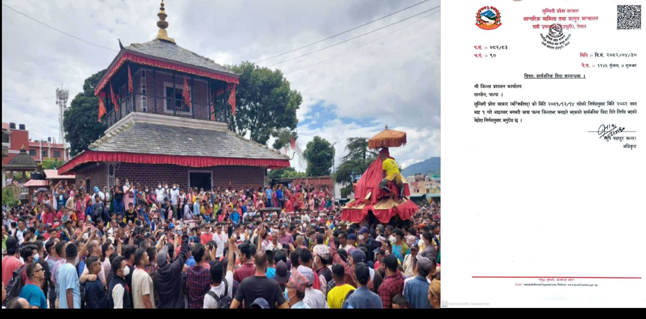 दाङ ३० साउन । लुम्बिनी प्रदेश सरकारले आगामी भदौ १ गते आइतबार पाल्पा जिल्लामा सार्वजनिक विदा दिने भएको छ । प्रदेश मन्त्रिपरिषद्को २०८१ साल चैत १४ गतेको निर्णय अनुसार सो दिन पाल्पामा भगवती जात्रा मनाइने भएकाले विदा दिने निर्णय गरिएको हाे । नेपाल र