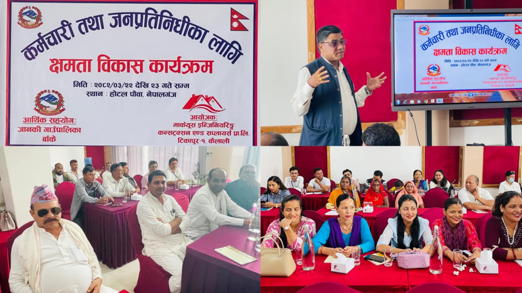 बाँके २२ असार । कर्मचारी र जनप्रतिनिधि का लागि स्थानीय सरकार संचालन तथा व्यवस्थापकीय आयाम बिषयक २ दिने क्षमता विकास तालिम जानकीमा शुरु भएको छ । जानकी गाउँपालिका बाँकेको आर्थिक सहयोग र मार्कयुस इन्जिनियरि∙ कन्सट्रक्सन एन्ड सप्लायर्स प्रा ली टिकापुर १ कैलालीको आयोजनामा आईतवारदेखि