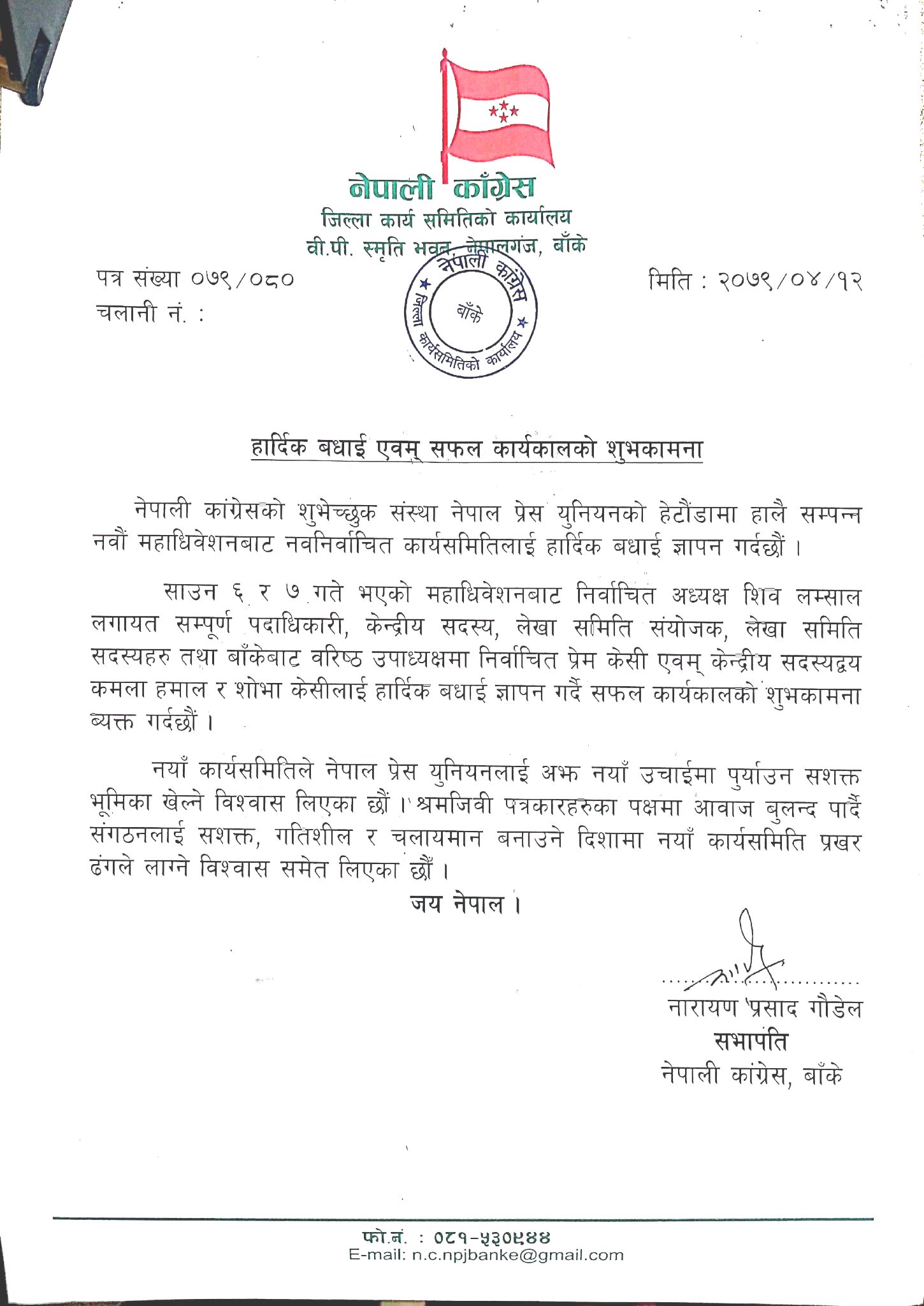 साउन १२, नेपालगन्ज । नेपाली कांग्रेस बाँकेले नेपाल प्रेस युनियनको नवनिर्वाचित कार्यसमितिलाई बधाई दिएको छ । सभापति नारायणप्रसाद गौडेलले विहीबार एक बधाई सन्देश दिँदै नेपाली कांग्रेसको शुभेच्छुक संस्था नेपाल प्रेस युनियनको हेटौंडामा हालै सम्पन्न नवौं महाधिवेशनबाट नवनिर्वाचित कार्यसमितिलाई हार्दिक बधाई ज्ञापन गरेका हुन् ।