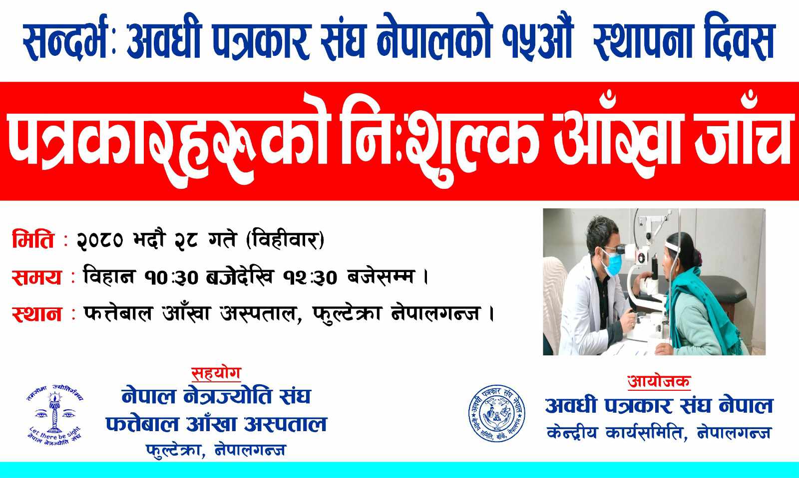 नेपालगन्ज २७ भदौ ।पत्रकारहरुका लागि नेपालगन्जमा निःशुल्क आँखा जाँच परीक्षण कार्यक्रमको आयोजना गरिएको छ । अवधी पत्रकार संघ नेपालको १५औं स्थापना दिवसको अवसरमा भोलि विहान फत्तेबाल आँखा अस्पताल, फुल्टेक्रा नेपालगन्ज निःशुल्क आँखा जाँच परीक्षण कार्यक्रमको आयोजना गरिएको हो । अवधी पत्रकार संघ नेपाल केन्द्रीय