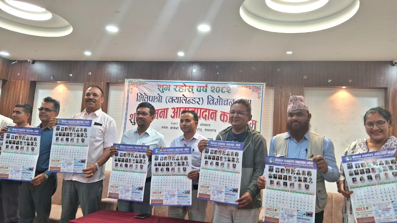 नेपालगञ्ज १५ बैशाख । नेपाल पत्रकार महासंघ बाँकेले प्रकाशन गरेको नयाँ बर्ष २०८२ सालको भित्तेपात्रो (क्यालेण्डर) विमोचन गरिएको छ । महासंघ बाँके शाखा अध्यक्ष नवीन गिरीको अध्यक्षता एवम् लुम्बिनी प्रदेश अध्यक्ष शुक्रऋषि चौलागाईको प्रमुख आतिथ्यतामा आयोजित एक कार्यक्रमका बीच साेमबार क्यालेण्डर विमोचनसंगै नयाँ बर्ष