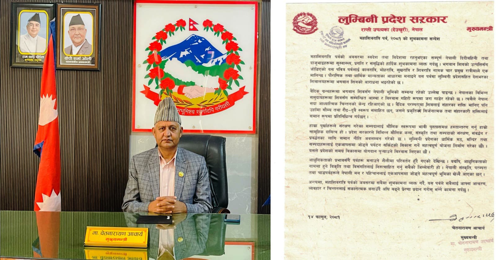 दाङ १४ फागुन । लुम्बिनी प्रदेशका मुख्यमन्त्री चेतनारायण आचार्यले मौलिक सांस्कृतिक सम्पदाको संरक्षण र सम्बर्द्धन गर्नु सबैको दायित्व भएको बताउनु भएको छ । महाशिवरात्रि पर्व, २०८१ को अवसरमा शुभकामना व्यक्त गर्दै प्रदेश सरकारले मौलिक कला, संस्कृति तथा सम्पदाको संरक्षणका लागि नीति अवलम्बन गरिरहेको बताउनु