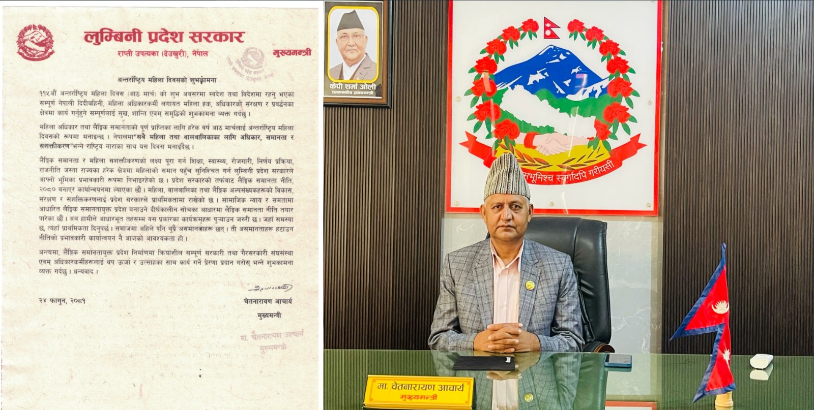 दाङ २४ फागुन । लुम्बिनी प्रदेशका मुख्यमन्त्री चेतनारायण आचार्यले लैङ्गिक समानतायुक्त प्रदेश बनाउने लक्ष्यसहित सरकार अघि बढिरहेको बताउनु भएको छ । ११५औँ अन्तर्राष्ट्रिय महिला दिवस (आठ मार्च) को अवसरमा शुभकामना व्यक्त गर्दै उहाँले लैङ्गिक समानता नीति निर्माण तथा कार्यान्वयनमार्फत प्रदेश सरकारले प्रभावकारी भूमिका निर्वाह