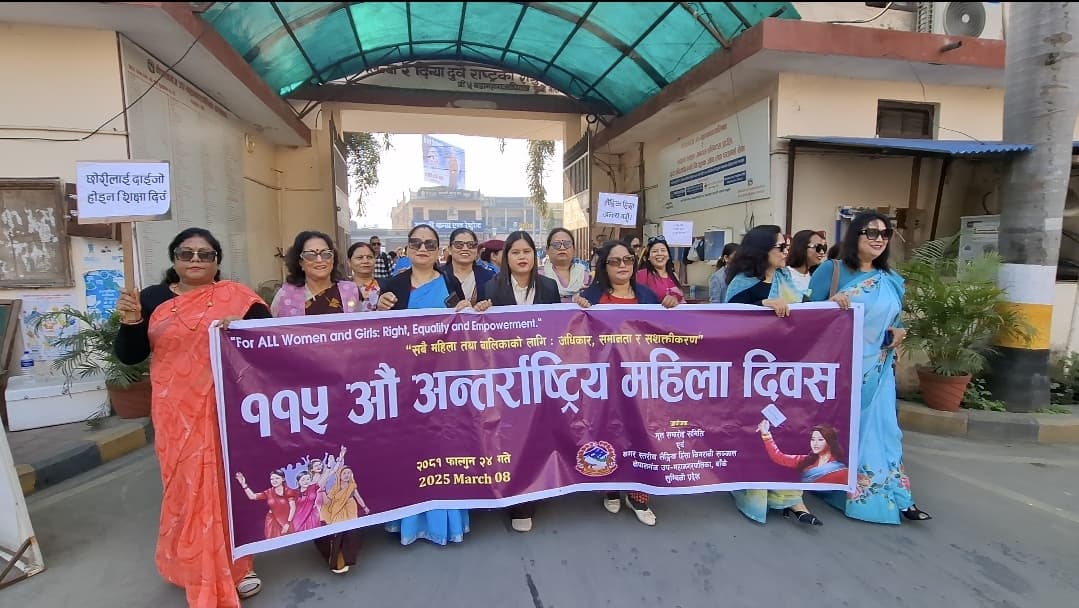 २४ फागुन बाँके । महिला अधिकारका क्षेत्रमा काम गर्नेहरु नेपालगन्जमा एकजुट भएर ११५ औ अन्तराष्ट्रिय नारी दिवस मनाएका छन । दिवसका अवसरमा नेपालगन्ज उपमहानगरपालिका बाट सुरु भएको ¥याली विपि चोक ,धम्बोजि चोक ,सेतुविक चोक ,न्युरोड ,त्रिभुवन चोक हुदै पुनः नेपालगन्ज उपमहानगरपालिकामा पुगेर कार्यक्रममा परिणत