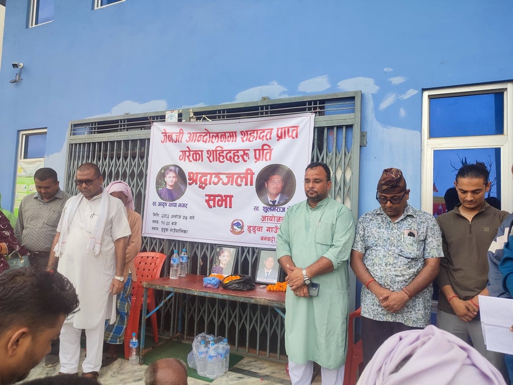 बाँके, ५ असोज । डुडुवा गाउँपालिकाले जेनजी आन्दोलनका क्रममा ‘शहिद’ भएका नेपालगन्जका युवा स्वर्गीय शुलभराज श्रेष्ठ र आयुष थापासहित सहादत प्राप्त गरेका व्यक्तीहरुको सम्झनामा बृहत श्रद्धाञ्जली सभा गरेको छ । गाउँपालिका कार्यालय परिसरमा आज आइतबार आयोजित श्रद्धाञ्जली सभालाई सम्बोधन गर्दै गाउँपालिका अध्यक्ष नरेन्द्रकुमार चौधरीले