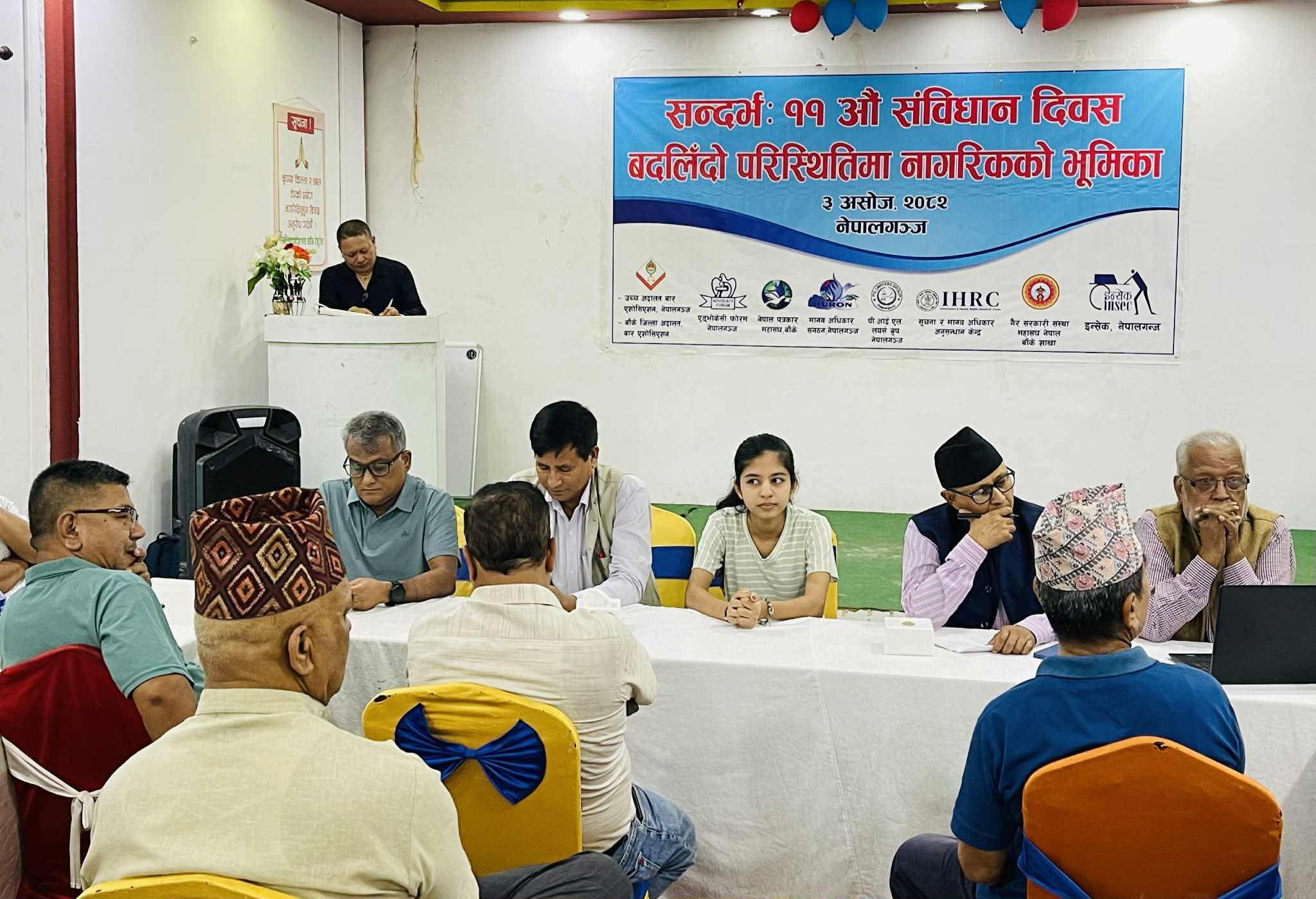 बाँके ०३ असाेज । नेपालको संविधान २०७२ को विकल्प खोज्न नहुनेमा जोड दिइएको छ । ११औं संविधान दिवसको अवसरमा विभिन्न संघसंस्थाको संयुक्त आयोजनामा शुक्रबार नेपालगञ्जमा सम्पन्न गरिएको छ । साे कार्यक्रममा ‘बदलिँदो परिस्थितिमा नागरिकको भूमिका’ विषयक कार्यक्रमका सहभागीहरुले जेन्जी पुस्ताको आन्दोलनले राजनीति संग्लिनुपर्ने सन्देश