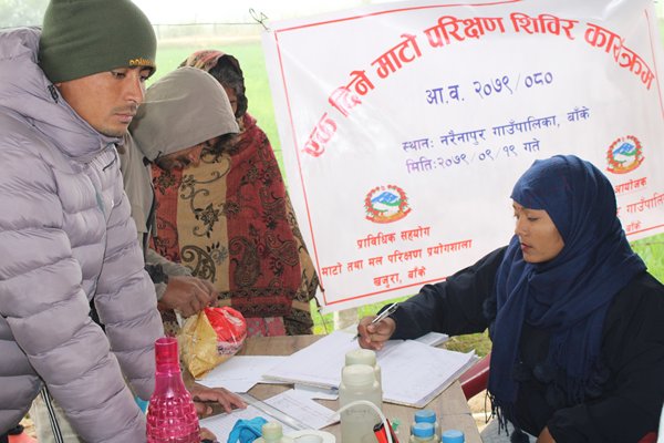 नरैनापुरमा माटो परिक्षण शिविर सम्पन् नरैनापुर (बाँके) पुस १९ । माटो सुहाँउदो खेतीवातीका लागि नरैनापुर गाँउपालिकाले माटो परिक्षण शिविर सम्पन्न गरेको छ । गाँउपालिका भित्रका विभिन्न ठाँउको माटोको अवस्था र उर्वराशाक्तीका बारेमा जानकारी लिएर साही अनुसारको बालीनाली लगाउने व्यवस्थाका लागि मंगलबार गाँउपालिका स्तरिय माटो