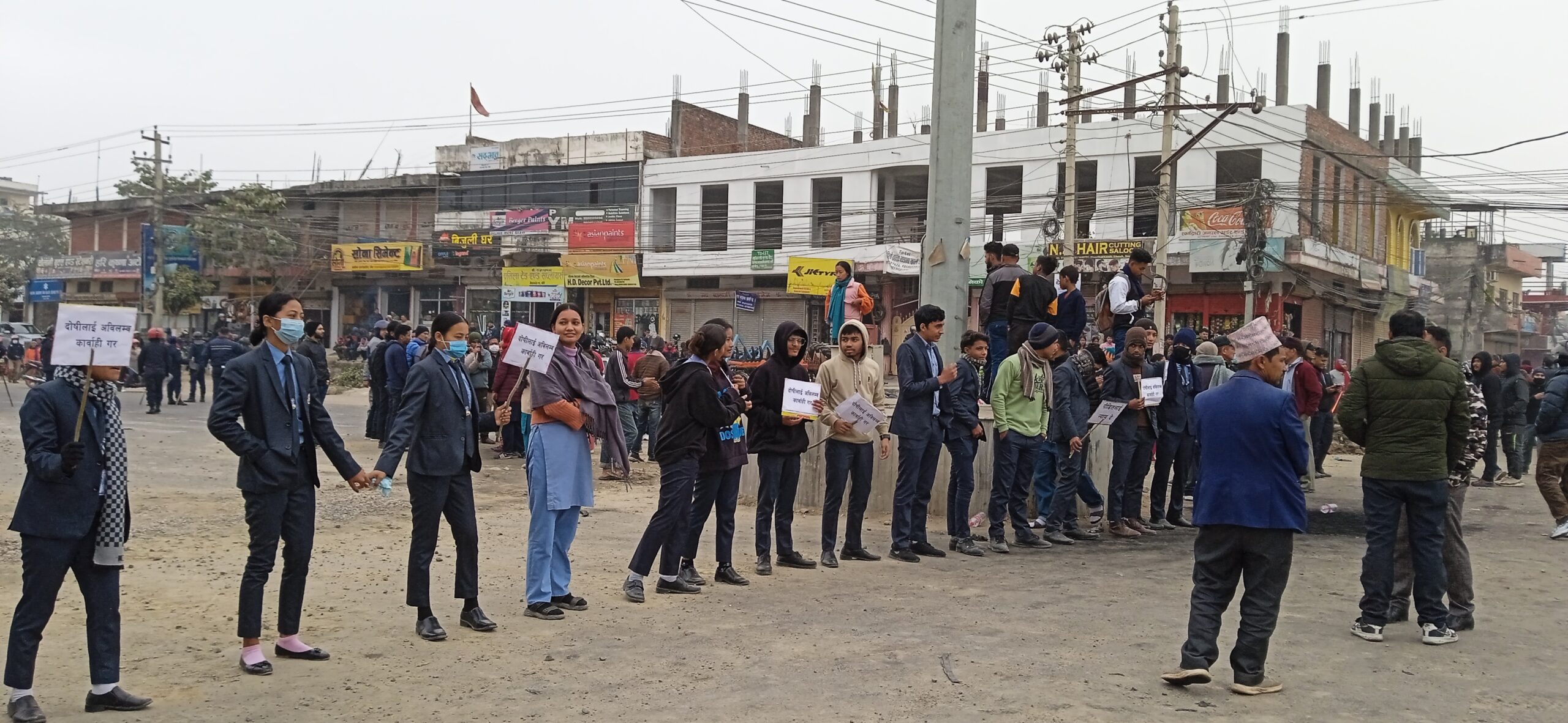१८ पौष, बाँके । बाँकेको नेपालगञ्ज उपमहानगरपालिका वडा नं. २ न्यूरोड स्थित भानुभक्त चोक नजिकै भएको ट्रक दुर्घटनालाई लिएर विद्यार्थीहरु सडकमा उत्रिएका छन । पिडित पक्षका लागि न्यायको माग गर्दै बिहान ७ बजे देखि नेपालगञ्जका मुख्य चोकहरुमा चक्काजाम गरिएको हो । घटना भएको