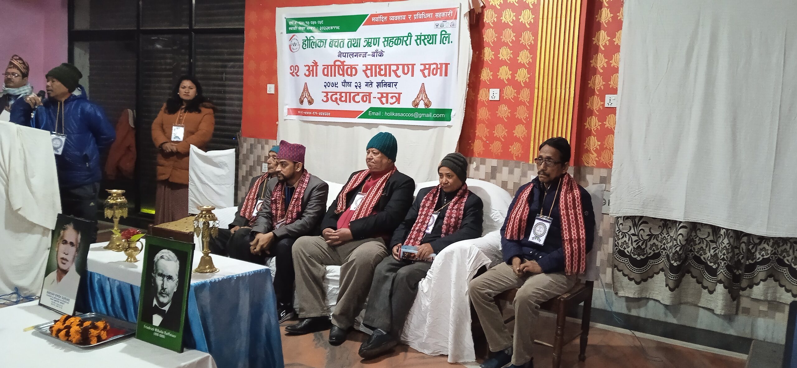 नेपालगन्ज २३ पुस । होलिका बचत तथा ऋण सहकारी संस्थाले २२औं साधारण सभा सम्पन्न भएको छ । शनिबार बाँकेको नेपालगञ्ज बाँकेमा २२औं साधारणसभा मनाइ रहेको होलिकाले ३० जना भन्दा बढीलाई सदस्य र कर्मचारीहरु लगाएतलाई सम्मान पत्र समेत वितरण गरेको थियो । गजेन्द्र कुमार खड्काको