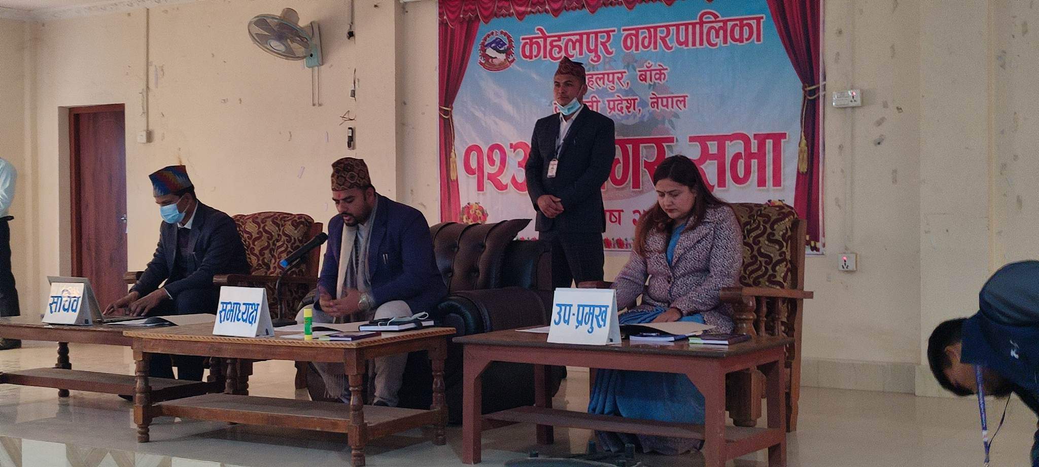 कोहलपुर २९ पुस । कोहलपुर नगरपालिकाको १२ औं नगरसभा आजदेखि सुरु भएको छ । उक्त नगरसभामा नगर प्रमुख पूर्ण प्रसाद आचार्यले अर्को बैठक बस्नु पूर्व सबै सभाषद समक्ष पुग्ने गरी चार वटा प्रस्ताव प्रस्तुत गर्नुभएको छ । कोहलपुर नगरपालिकामा साविक स्थानीय