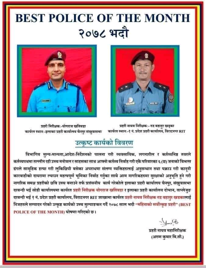 प्रहरी कर्मचारीहरूको मनोवल उच्च बनाउने तथा सम्पादित कार्यको उचित मूल्याङ्कन गर्दै १ नम्बर प्रदेश प्रहरी कार्यालय विराटनगरले १ नम्बर प्रदेशभरिका प्रहरी कर्मचारीहरू मध्येबाट प्रत्येक महिना सर्वोत्कृष्ट प्रहरी छनौट गर्दै आएको छ ।
