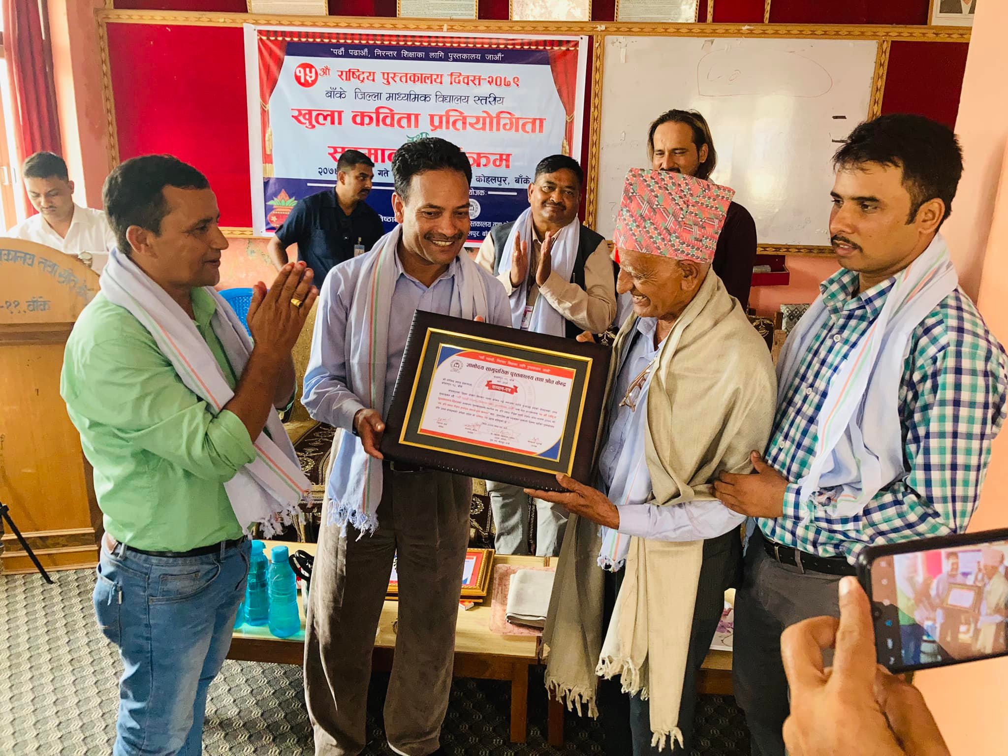 पुस्तकालयका अध्यक्ष चेतकान्त भट्टराईको अध्यक्षमा भएको कार्यक्रममा विभिन्न क्षेत्रका ३ जना विशिष्ट ब्यक्तिहरुलाई सम्मान गरीएको थियो भने पुस्तकालय दिवसकै अवसरमा आयोजित खुल्ला कबिता प्रतियोगिताका बिजयीहरुलाई समेत पुरस्कृत गरीएको छ ।