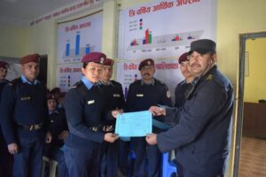 कार्यक्रममा प्रमुख अतिथी प्रहरी उपरीक्षक सन्तोष सिंह राठौरले तालिममा सिकेका ज्ञान तथा सिपलाई कार्य क्षेत्रमा कुशलता पुर्वक निर्वाह गर्न निर्देशन समेत दिनु भएको थियो ।