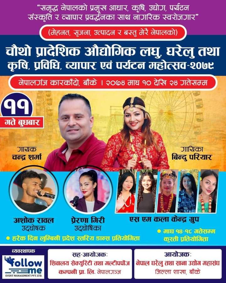 उनका अनुसार आज भने राष्ट्रिय ख्याती प्राप्त कलाकार आउने भएका छन । दर्शको मनोरञ्जनका लागि आज गायक चन्द्र शर्मा र गायिका बिन्दु परियार आउने कार्यक्रम तय भएको छ ।