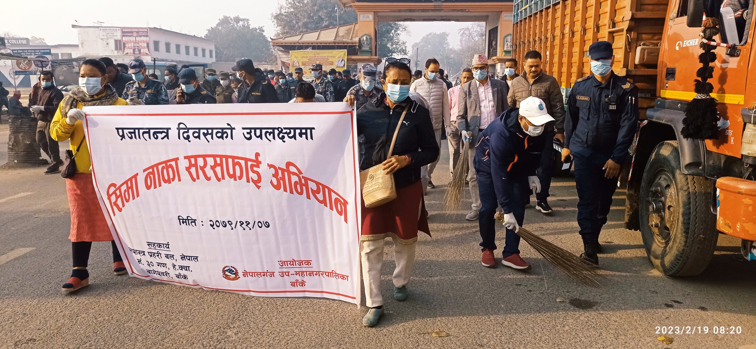 नेपालगञ्ज उपमहानगरपालिकाले सरसफाई अभियान थालेको छ । प्रजातन्त्र दिवसको उपलक्ष्यमा नेपाल–भारत सीमा नाका जमुनाहाबाट सरसफाई अभियान थालिएको हो । सशस्त्र प्रहरी बल नेपाल नम्बर ३० गण हेडक्वाटर बागेश्वरी बाँकेको सहकार्यमा सीमा नाकामा सरसफाई गरिएको हो । सरसफाई कार्यक्रममा प्रमुख जिल्ला अधिकारी विपिन आचार्य, नगर प्रमुख प्रशान्त विष्ट, उपप्रमुख कमरुद्दिन राई, प्रहरी प्रमुख सन्तोषसिंह राठौर, सशस्त्र प्रहरी प्रमुख रमेश शाही, सरसफाई अभियन्ता डा. विनोद कर्ण, सशस्त्र प्रहरी, नेपाल प्रहरी, नगर प्रहरी, सरसफाईकर्मी लगायत उपस्थित थिए ।
