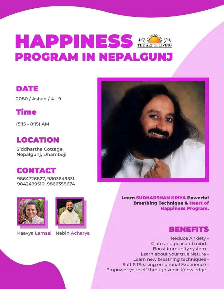 कार्यक्रम नेपालगन्जको सिद्धार्थ कटेजमा आउदो सोमबार बाट बिहान ५:१५ देखि ८:१५ बजे सम्म रहन्छ र कार्यक्रमको समापन असार ९ गते शनिबारको दिन रहनेछ। कार्यक्रम हप्ताको एकदिन शनिबार बिहान ५:३० मा साप्ताहिक फलोअप र साझ ५:३० बजेबाट सत्सङ नेपालगन्ज एम. पि. इन्टरप्रैजेज रहेको भवनमा हुने द आर्ट अफ् लिभिङ को स्वयंसेवी अरुणा गुरुङले बताइन् । सुरु हुन गइरहेको ‘ह्याप्पिनेस कार्यक्रम’ लिन इच्छुक व्यक्तिले निम्नलिखितको सम्पर्क न. हरुमा सम्पर्क गर्न सक्नुहुन्छ।