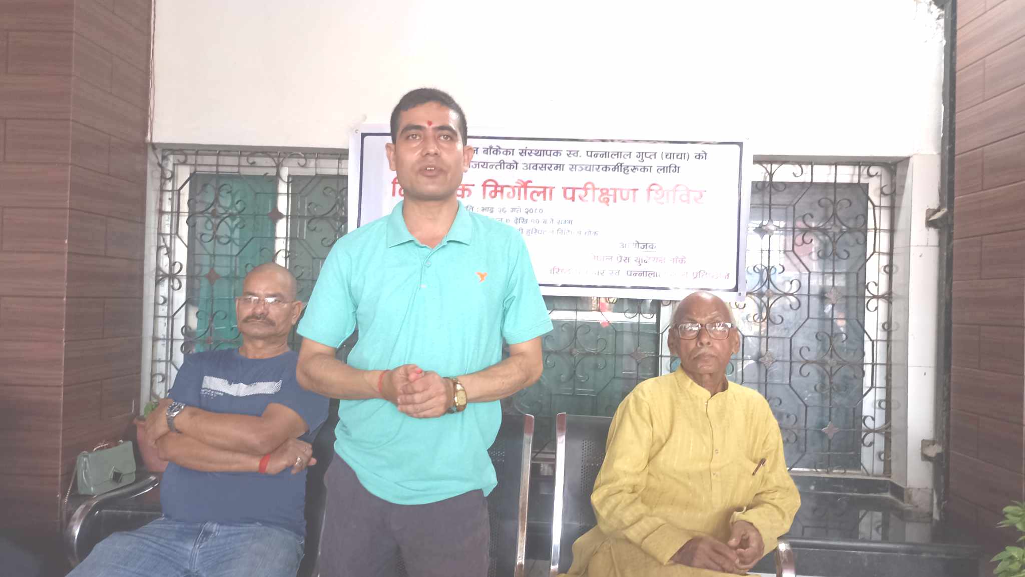 नेपाल प्रेस युनियनका संस्थापक अध्यक्ष एवम् प्रेस स्वतन्त्रता सेनानी स्वर्गीय पन्नालाल गुप्त ‘चाचाजी’ को ९५ औं जन्मजयन्तीका अवसरमा सञ्चारकर्मीको निःशुल्क मिर्गाैला परीक्षण गरिएको छ । युनियन बाँकेले विगतको वर्षझै यसवर्ष पनि सञ्चारकर्मीको निःशुल्क मिर्गाैला परीक्षण गरेको हो । युनियन बाँके र बरिष्ठ पत्रकार पन्नालाल गुप्त प्रतिष्ठानको संयुक्त आयोजना तथा सेन्ट्रल सिटी हस्पिटलको सहकार्यमा मंगलबार सो शिविर गरिएको हो ।हस्पिटल परिसरमा बिहान आयोजित कार्यक्रमको उद्घाटन नेपाल प्रेस युनियनका बरिष्ठ केन्द्रीय उपाध्यक्ष प्रेम केसी र प्रतिष्ठानका अध्यक्ष बिजय गुप्ताले गर्नुभएको थियो । युनियन बाँकेका अध्यक्ष प्रियास्मृति ढकालको सभापतित्वमा संचालन गरिएको उद्घाटन कार्यक्रममा वक्ताहरूले युनियनका संस्थापक तथा सेनानी गुप्तको जीवनशैलीको स्मरण गरेका थिए । सो शत्रमा बोल्दै केन्द्रीय वरिष्ठ उपाध्यक्ष केसीले स्वर्गीय चाचाजीले आफ्नो जीवनकालमा सधैं साईकल चलाउने गरेको स्मरण गर्दै सञ्चारकर्मी स्वस्थ हुनका लागि नियमित रुपमा साईकल चलाउनुपर्नेमा जोड दिनुभयो ।नेपाल पत्रकार महासंघ लुम्बिनी प्रदेशका उपाध्यक्ष शुकऋषि चौलागाईले चाचाजीले पत्रकाररिताको मर्यादालाई विशेष ध्यान दिएको बताउनुभयो । युनियन बाँकेका अध्यक्ष ढकालले सञ्चारकर्मीका लागि स्वास्थ्य नै महत्वपुर्ण भएकाले विगतका वर्षझै यसपटक पनि युनियन बाँकेले निःशुल्क मिर्गाैला परिक्षण कार्यक्रम राखेको बताउनुभयो । युनियन बाँकेका उपाध्यक्ष कमल खत्रीले स्वागत गरेको कार्यक्रम सञ्चालन सचिव भिष्म लोधले गर्नुभएको थियो । शिविरमामा ६८ जना सञ्चारकर्मीले मिर्गौलाको चेकजाँच गराएको सचिव लोधले जानकारी दिनुभयो ।