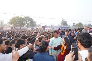 नेपालगन्ज १६ माघ। बुधबार सूर्यास्त हुँदै थियो । प्रादेशिक महोत्सवको अन्तिम कलाकार चक्र बम आधा दर्जन गीत गाएर विदावारीको चरणमै थिए । घर फर्कँनेको लर्को थियो । गायक बमले जब …भन् साली तेरी दिदी काँ छ…देउडा गीत गाउन थाले मञ्चमै दुई वटा समूहको नाच बन्यो । गायिका भूमिका गिरी, उद्घोषक शोभा त्रिपाठी, ओविराज आचार्य, समीरमान श्रेष्ठको एउटा समूह बन्यो । सांस्कृतिक उपसमितिका सदस्यले मञ्चमाथि अर्को समूह बनाए । मञ्चको तलपट्टि अतिथि बसेको स्थलमा आयोजककोे छुट्टै समूह बन्यो । लुम्बिनी प्रदेशका पूर्वमन्त्री तथा प्रदेशसभा सदस्य कृष्णा केसी नमूना पनि संघका अध्यक्ष टंकबहादुर धामी नेतृत्वमा पदाधिकारी र सदस्य सम्मिलित समूहमा नाच्न थालिन् । भाका बुझे वा बुझेनन्, रुपैडिया नगरका मेयर डा.उमाशंकर वैश्य, रुपैडिया व्यापार मण्डल अध्यक्ष, महासचिव पनि हात, खुट्टाको तालमा ताल मिलाउँदै नाच्न थाले । मञ्चको पूर्वी छेउमै महिलाको अर्को समूह बन्यो । मञ्च परिसरमा मात्र आधा दर्जन समूहमा देउडा नाच भयो । घर जान तम्सिएका दर्शक पनि फर्केर आए र दर्जनौं समूहमा नाच्न थाले । गायक बमले गीत थप्दै गए । प्रादेशिक महोत्सव देउडामय भयो । के युवा, के युवती, के बृद्ध, बालबालिका सबै समूह समूह बनाएर नाच्न थाले । महोत्सव परिसरमा आठ दश जनादेखि सय डेढ सय जनाका दर्जनौं समूहमा देउडा नाच भयो । ‘गीत त सबैले गाउँछन् तर सबै दर्शकलाई नचाउन सक्ने खुबी देखेर दर्शकहरु गायक वमको प्रशंशा गरिरहेका थिए ।